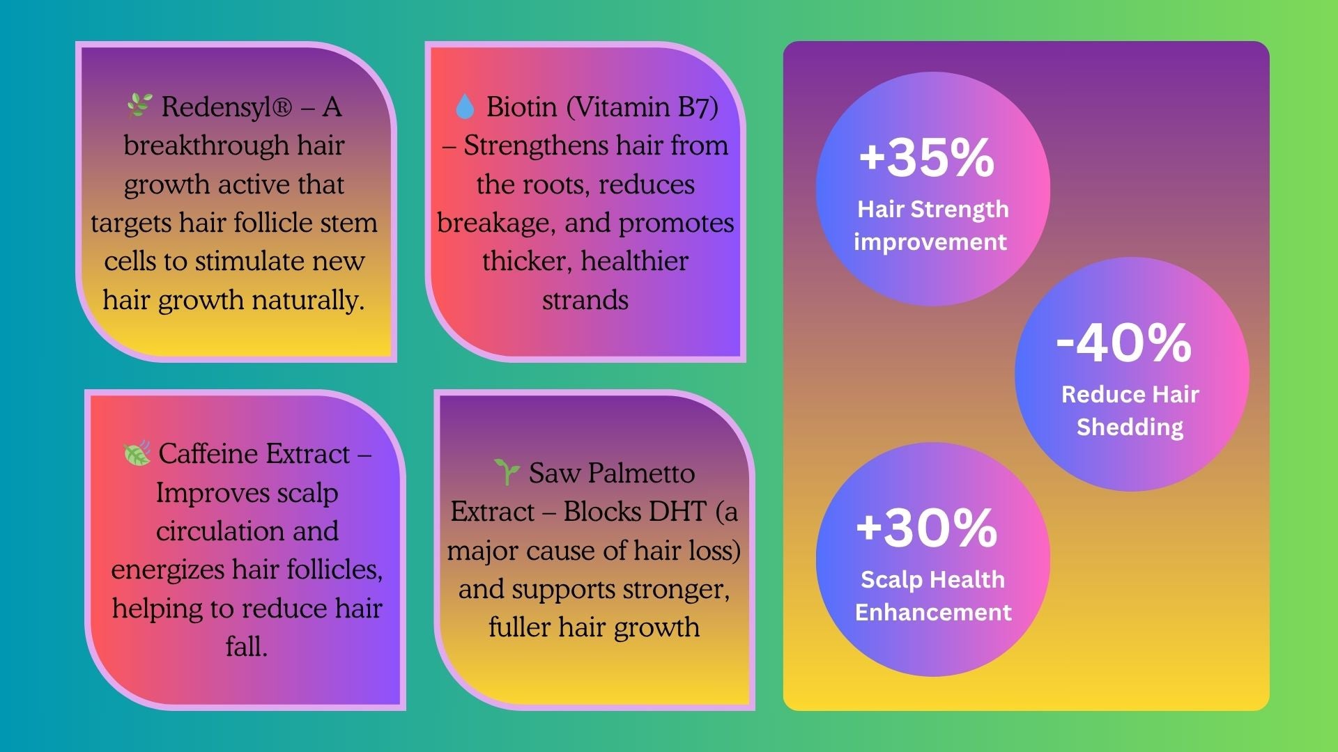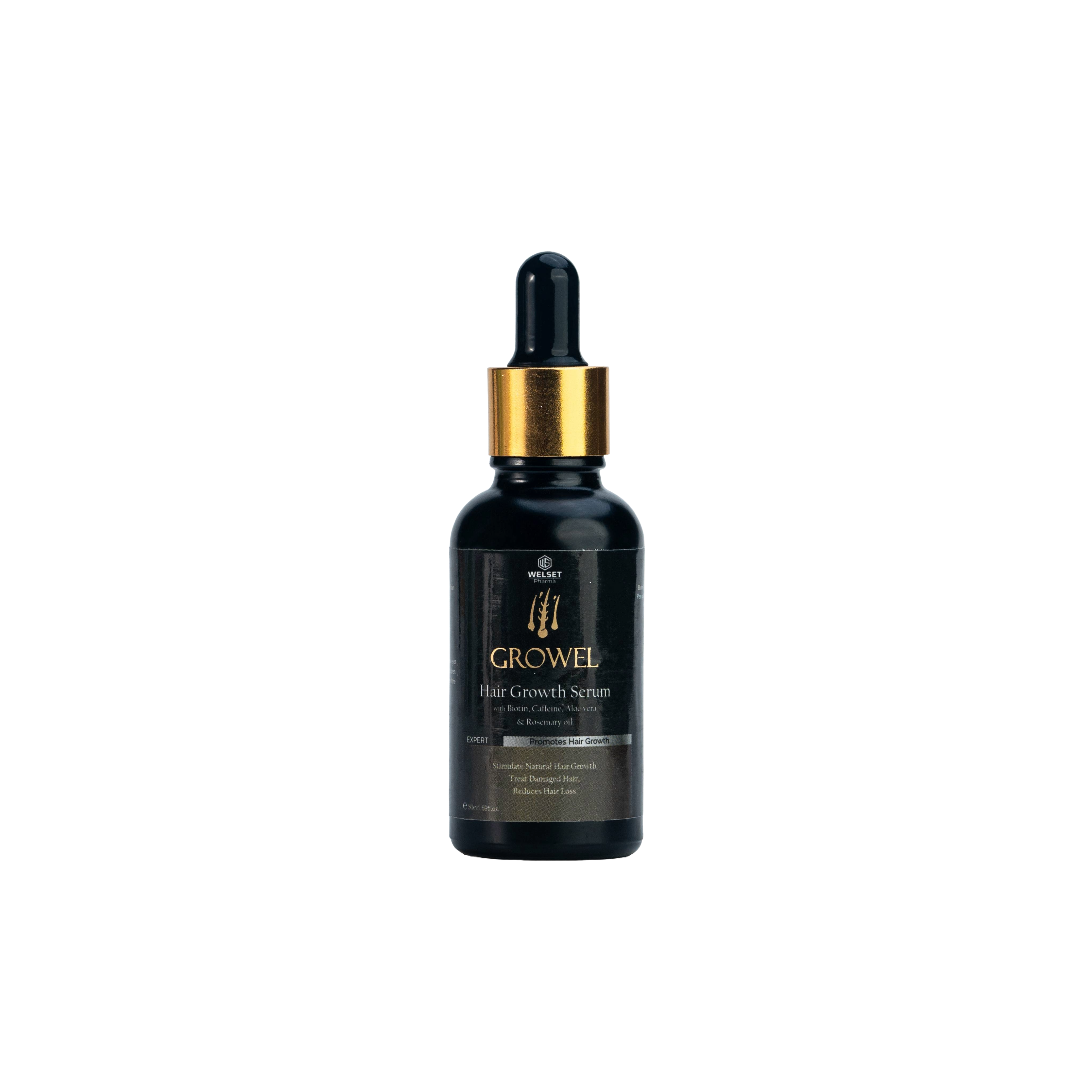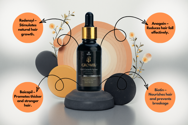 Growel Hair Growth Serum, enriched with Redensyl, Anagain, Baicapil, Biotin, and natural oils & extracts, stimulates natural hair growth, reduces hair fall, strengthens and thickens the hair, nourishes and hydrates the scalp, and improves overall hair texture for a smooth and healthy look.